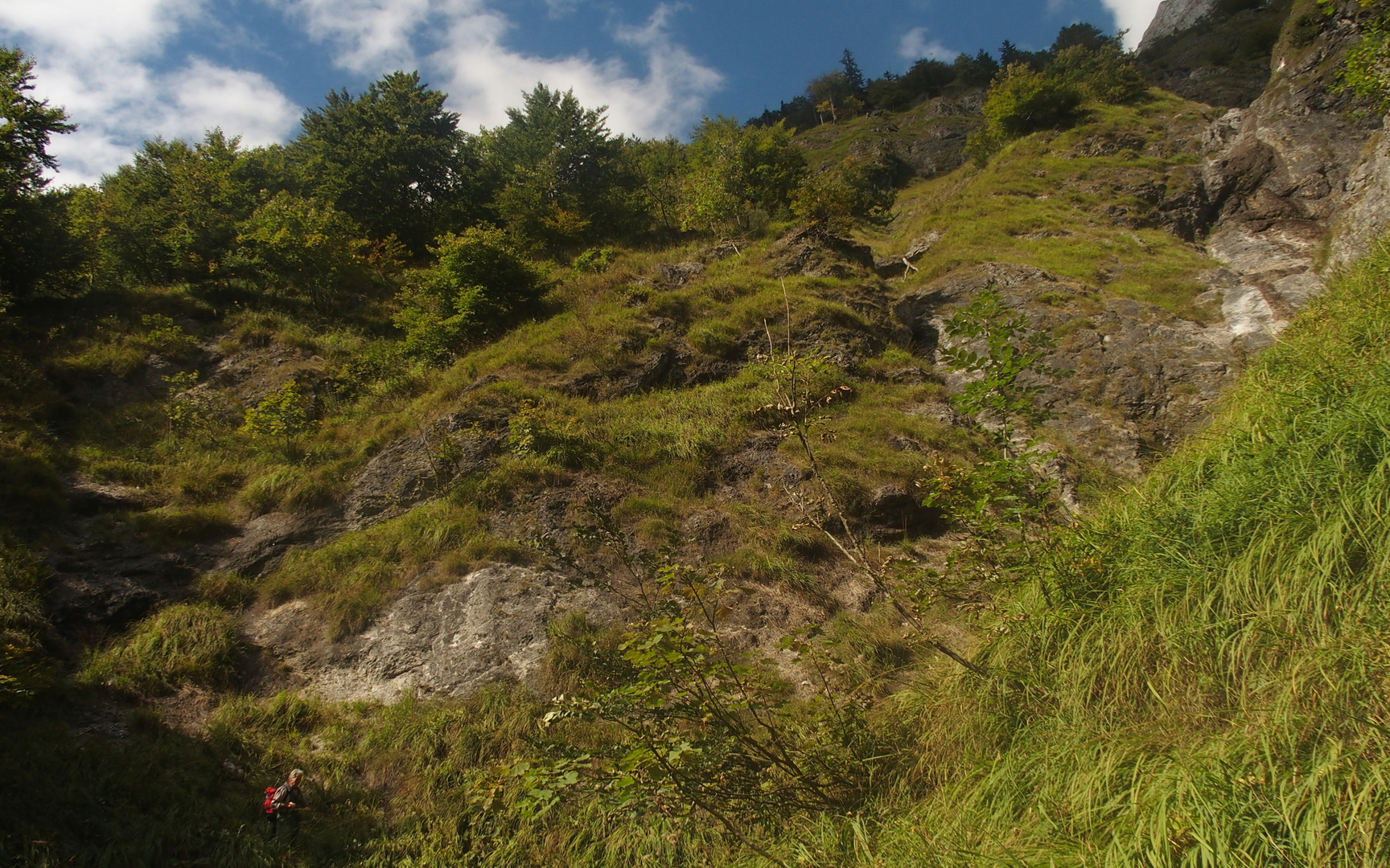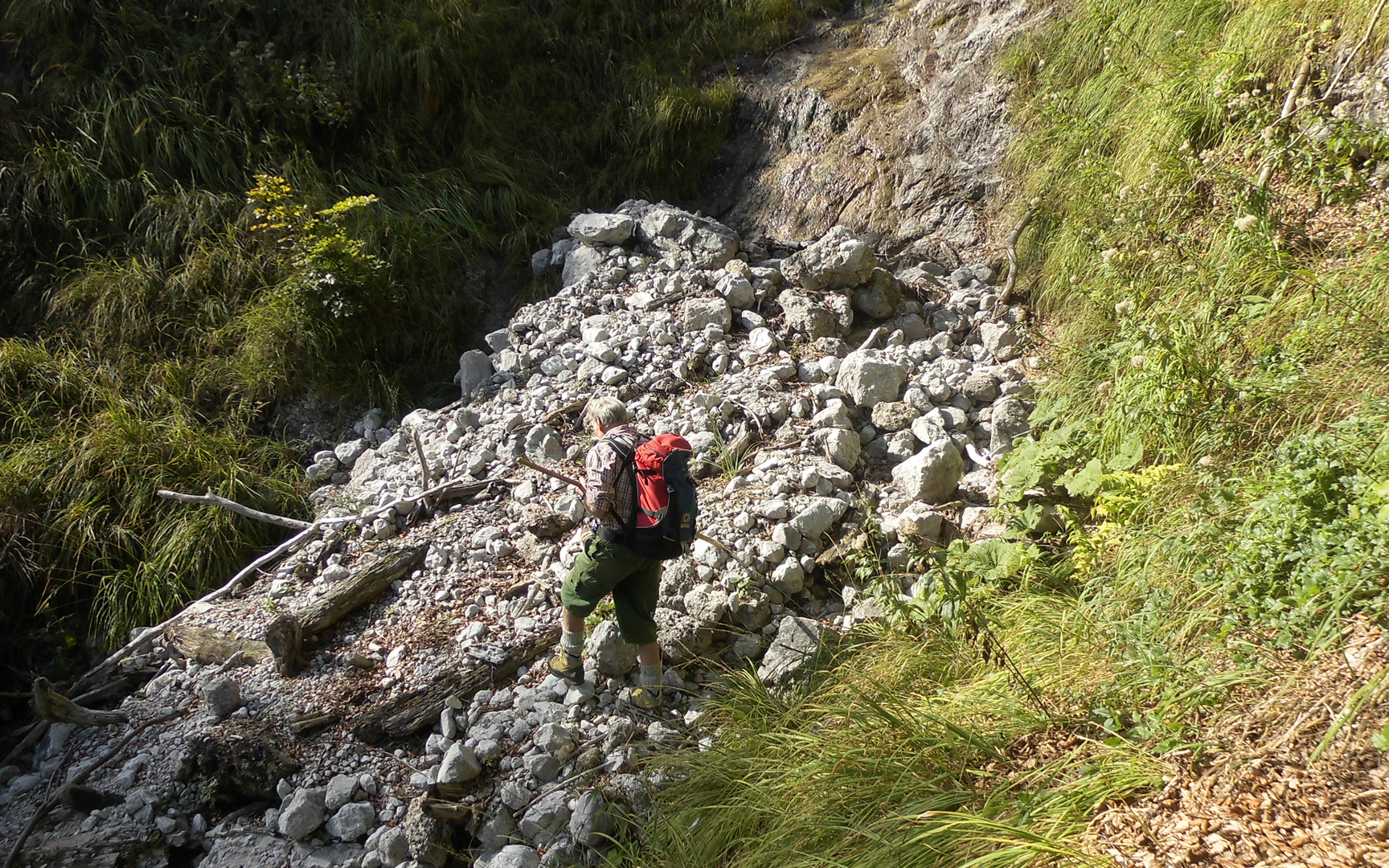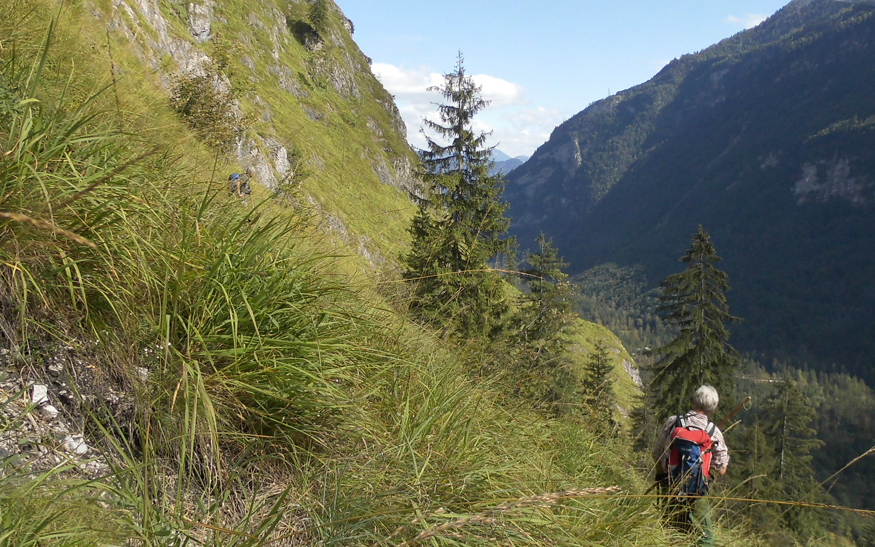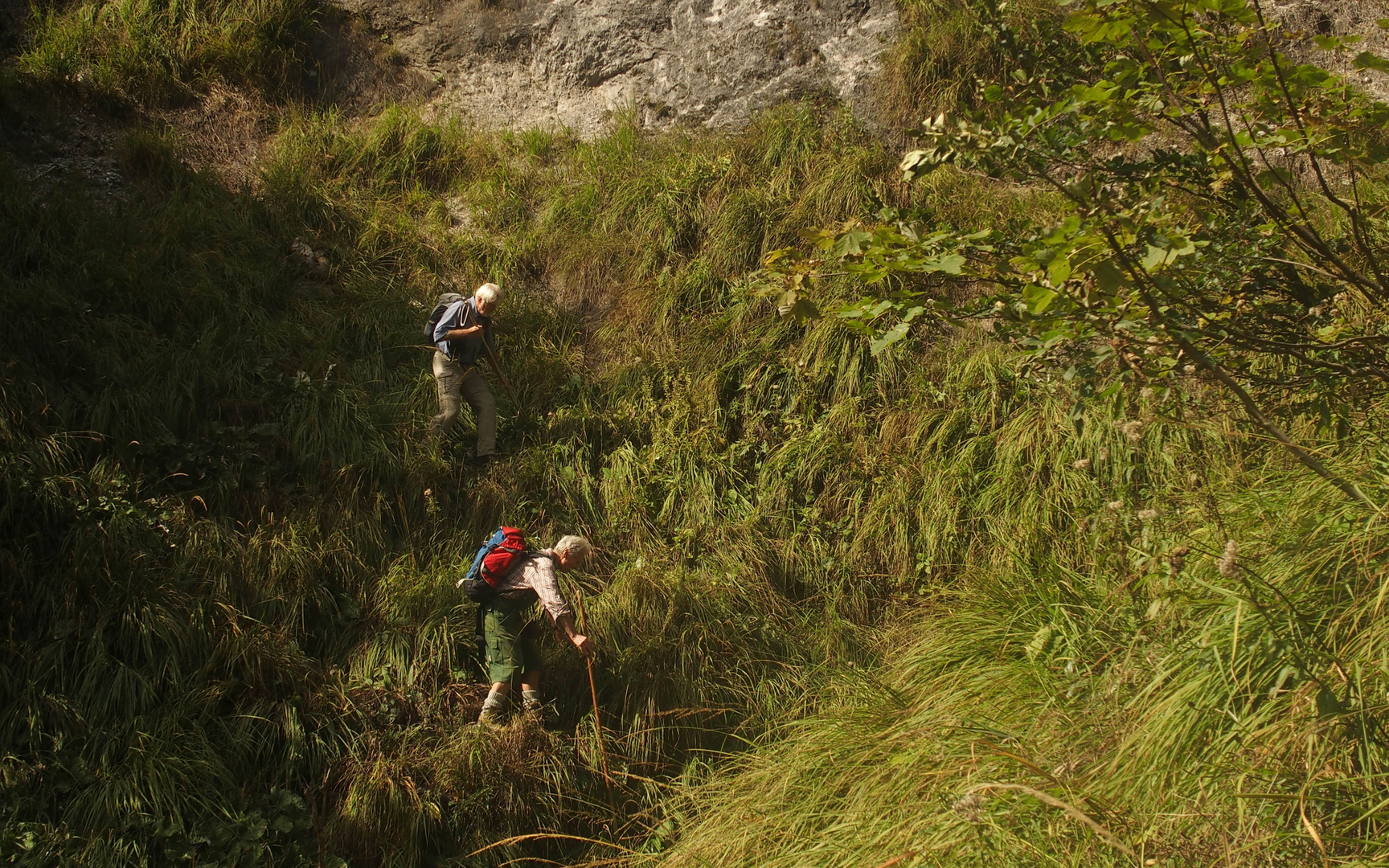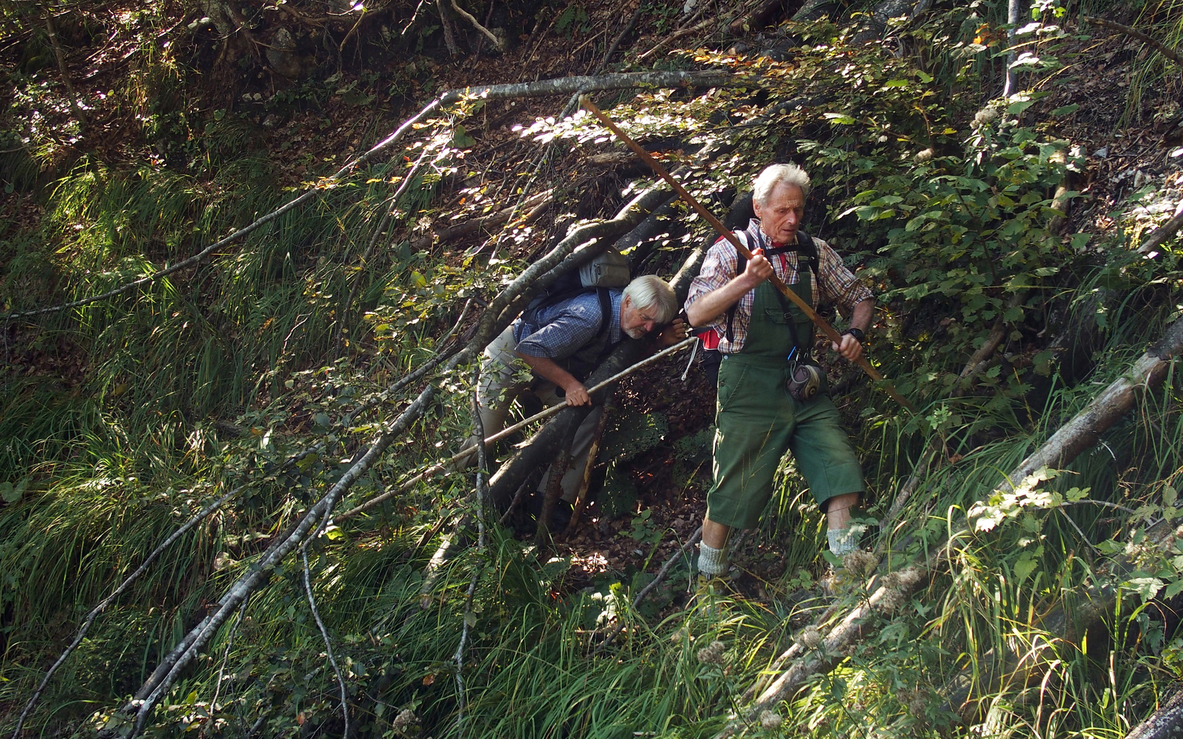 Der Steig, der früher ein Reitweg war, ist mit den Jahren zum Teil kaum noch zu finden. Lawinen haben ihn stellenweise weggeräumt, Stauden wachsen ihn zu. Für uns erschwerend kam hinzu, dass das hohe Gras der herbstlichen Vegetation den Verlauf oft nicht klar erkennen ließ.