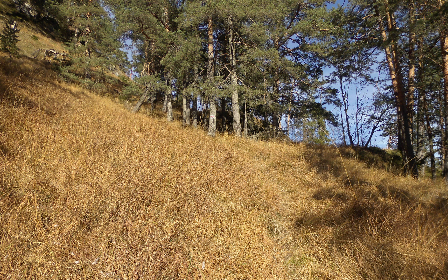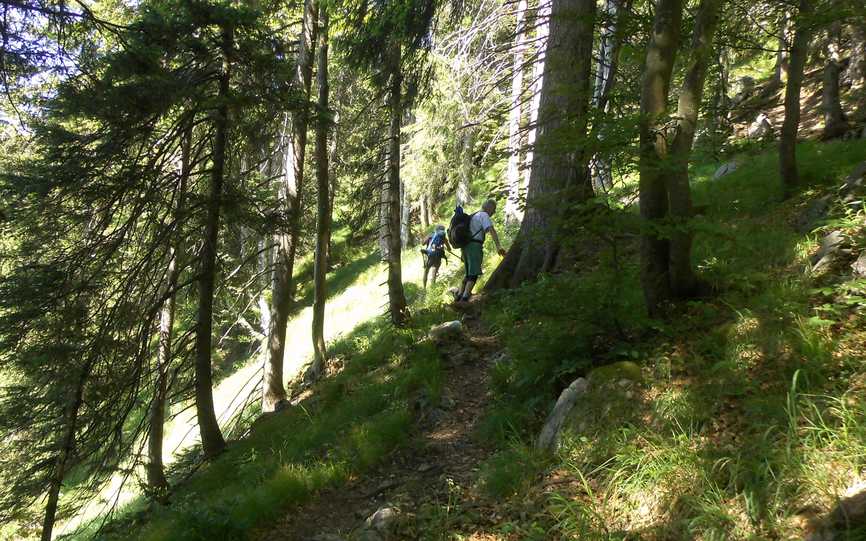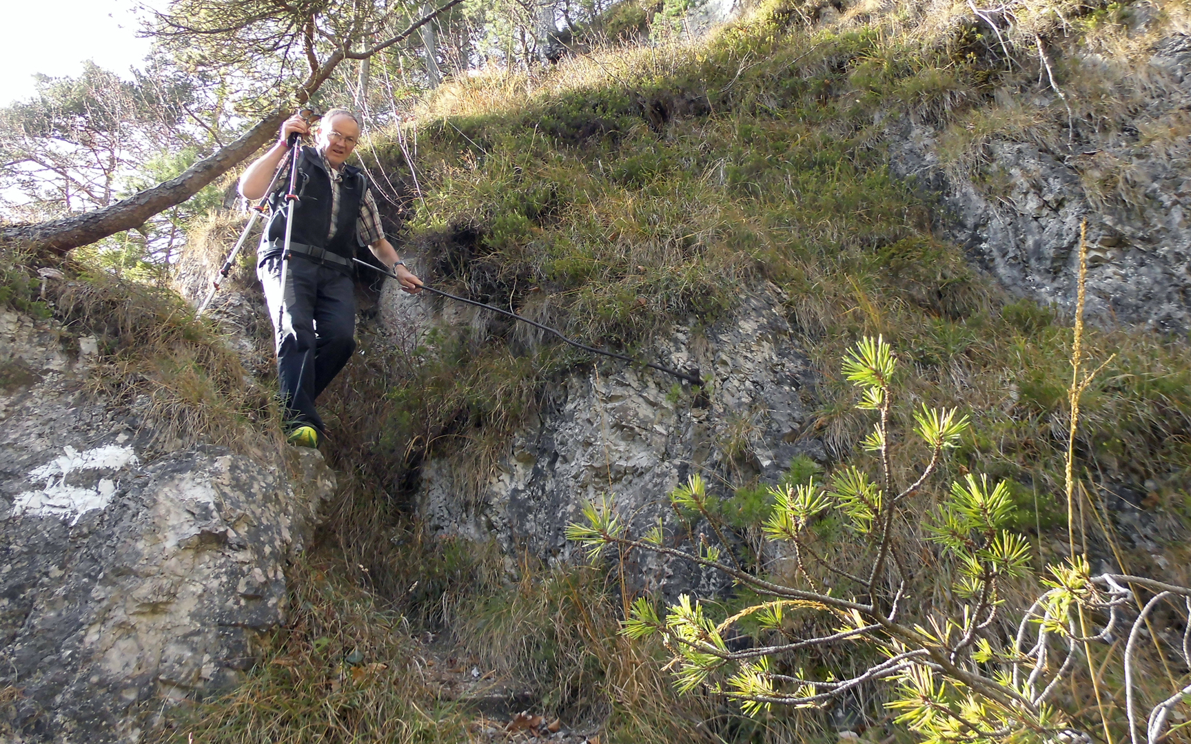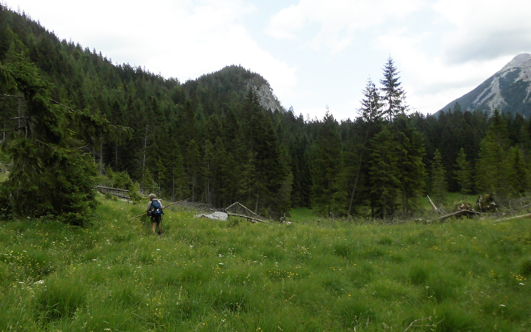 Der Steig, der früher ein Reitweg war, ist mit den Jahren zum Teil kaum noch zu finden. Lawinen haben ihn stellenweise weggeräumt, Stauden wachsen ihn zu. Für uns erschwerend kam hinzu, dass das hohe Gras der herbstlichen Vegetation den Verlauf oft nicht klar erkennen ließ.