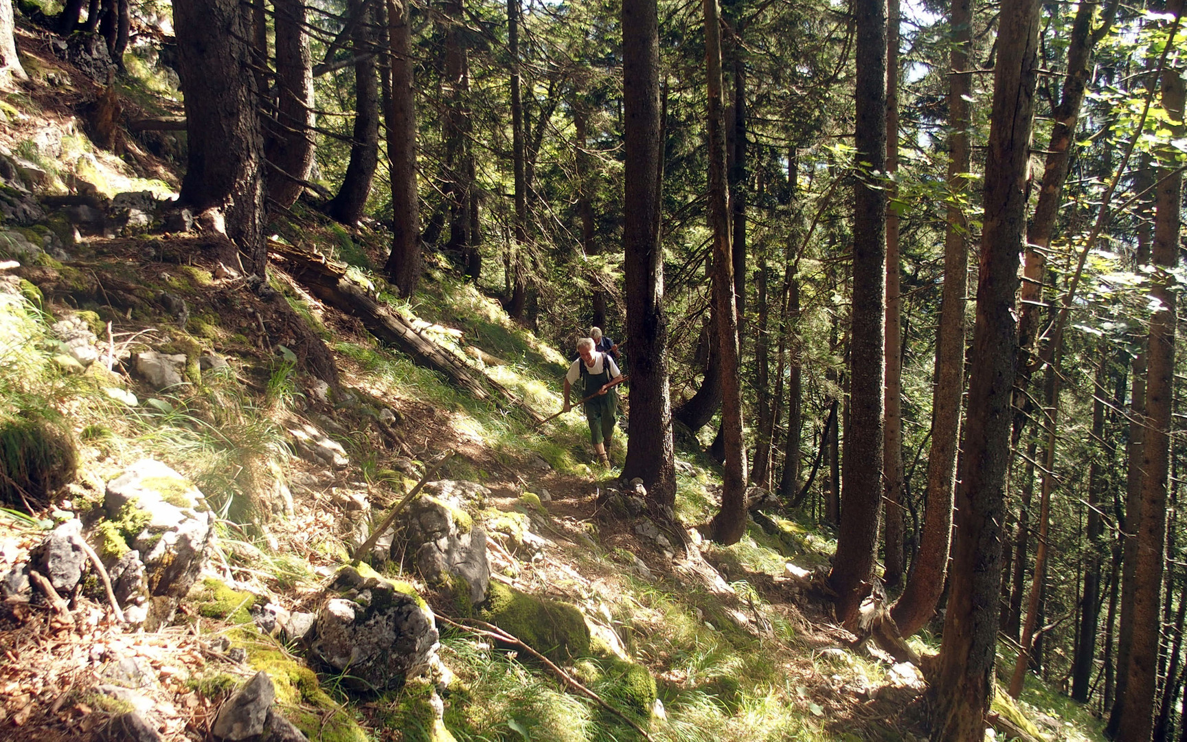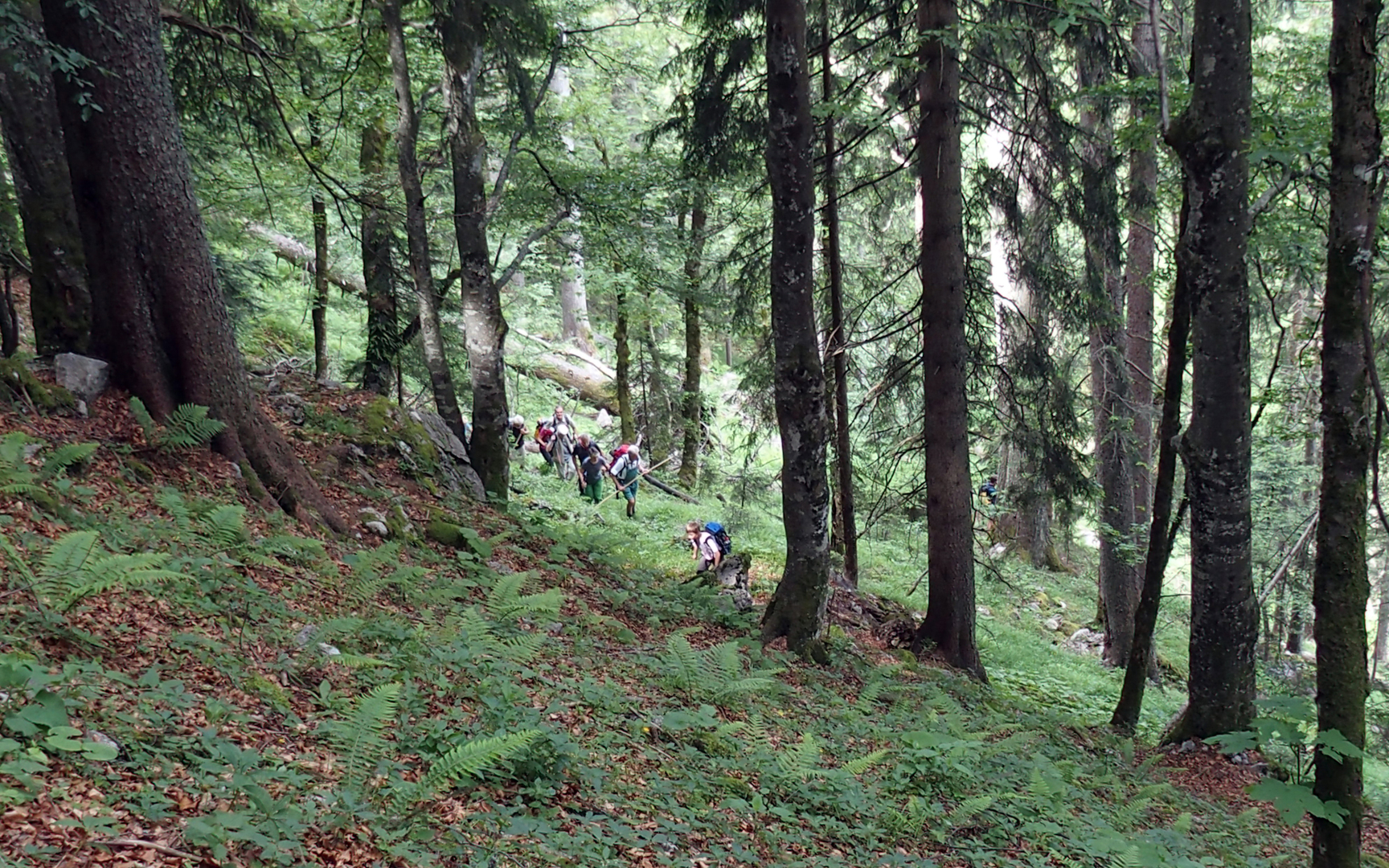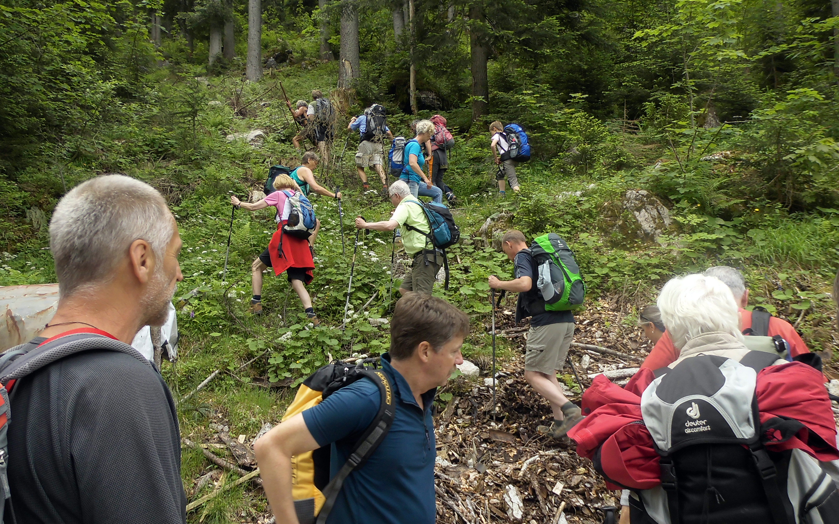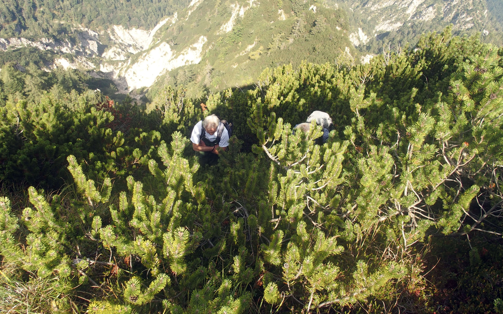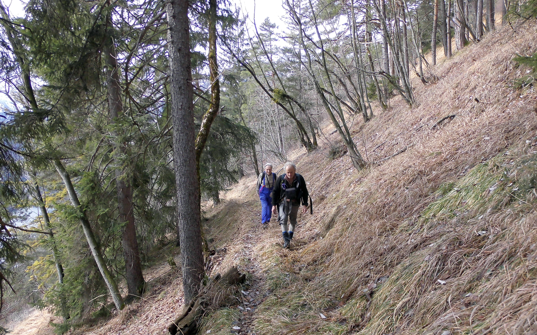 Der Steig, der früher ein Reitweg war, ist mit den Jahren zum Teil kaum noch zu finden. Lawinen haben ihn stellenweise weggeräumt, Stauden wachsen ihn zu. Für uns erschwerend kam hinzu, dass das hohe Gras der herbstlichen Vegetation den Verlauf oft nicht klar erkennen ließ.