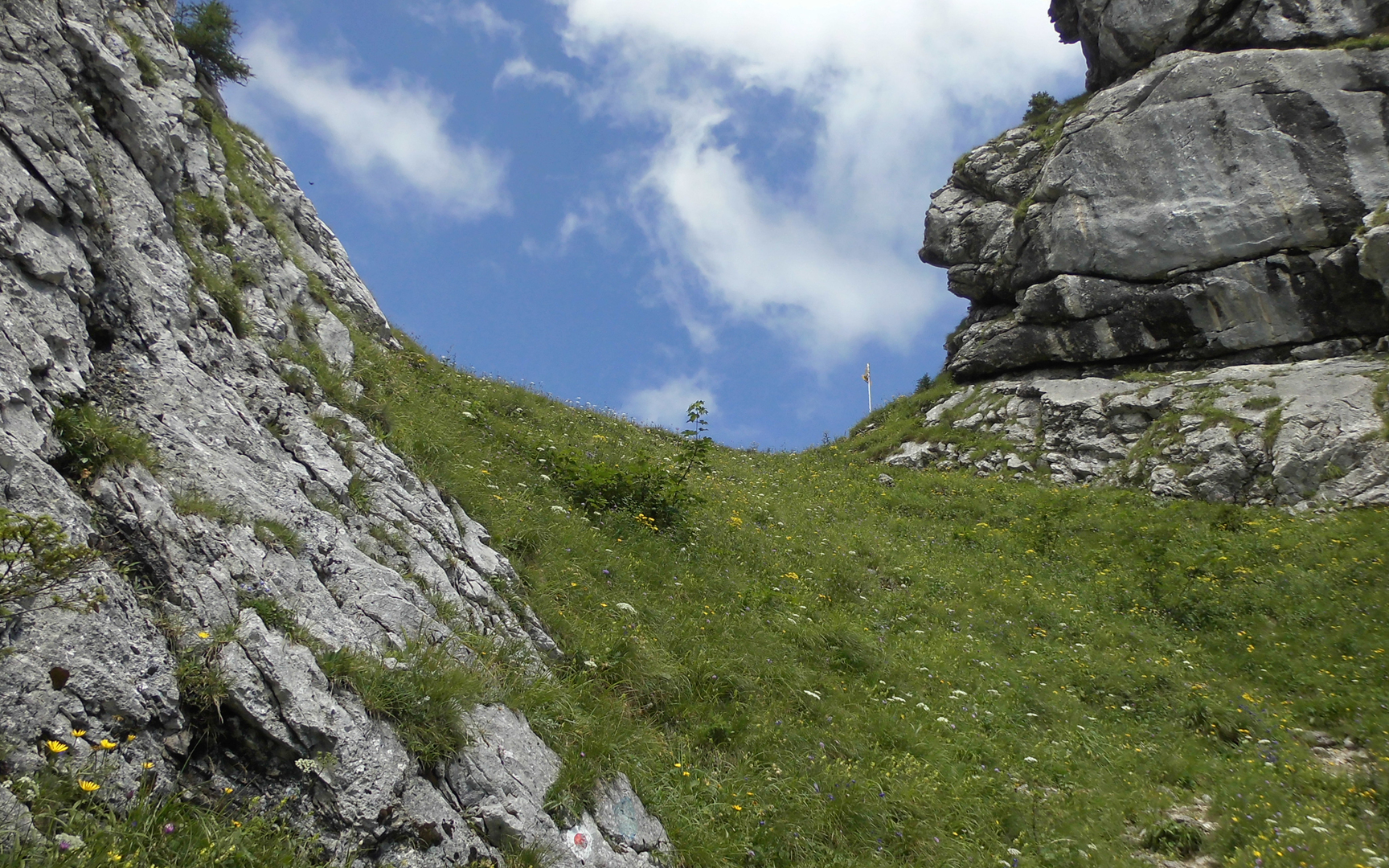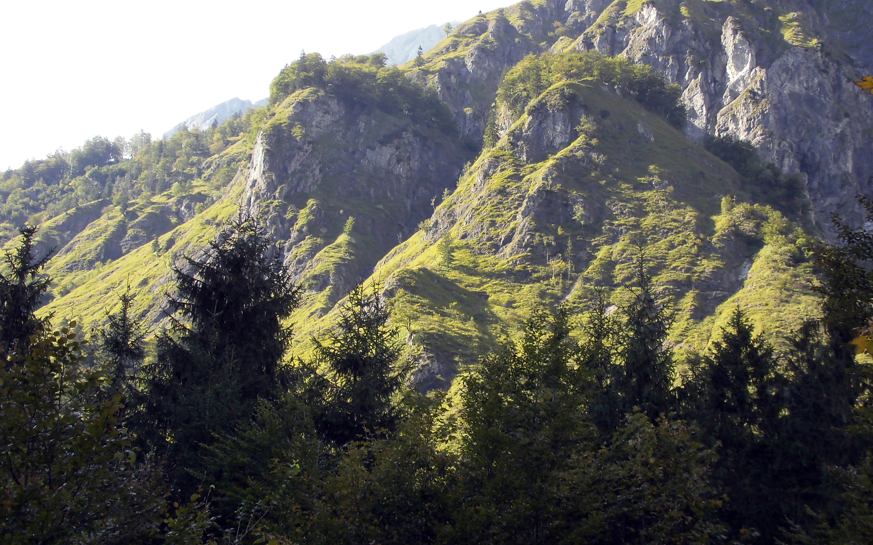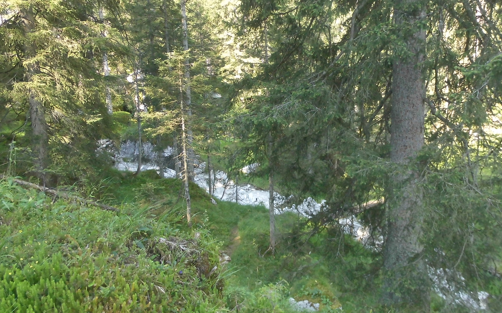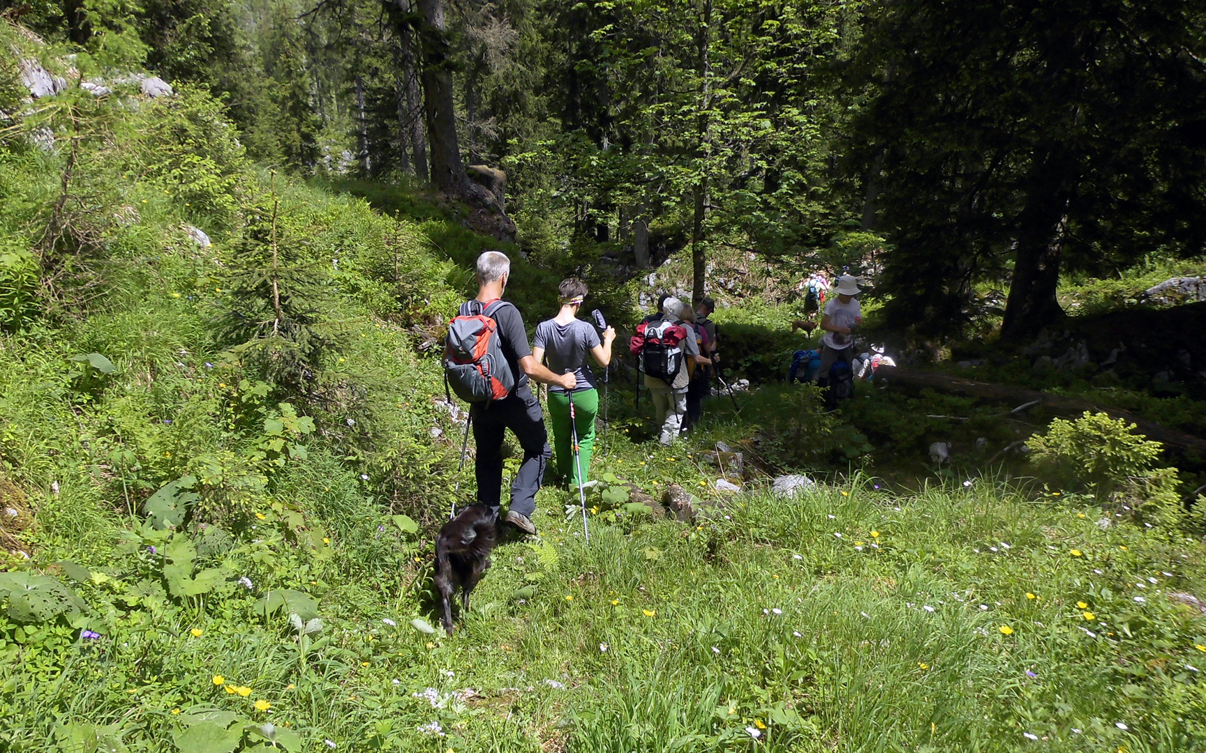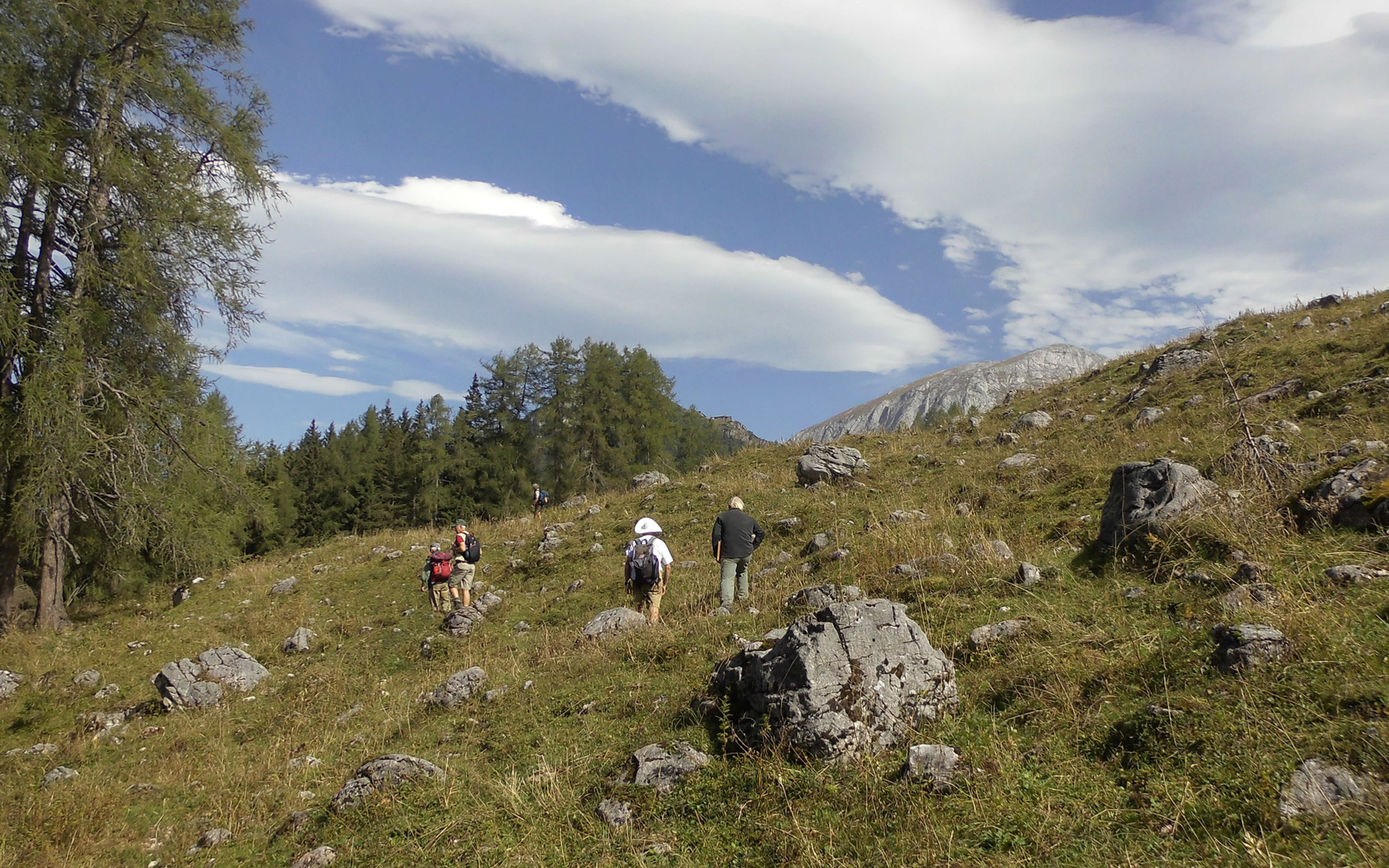 Der Steig, der früher ein Reitweg war, ist mit den Jahren zum Teil kaum noch zu finden. Lawinen haben ihn stellenweise weggeräumt, Stauden wachsen ihn zu. Für uns erschwerend kam hinzu, dass das hohe Gras der herbstlichen Vegetation den Verlauf oft nicht klar erkennen ließ.