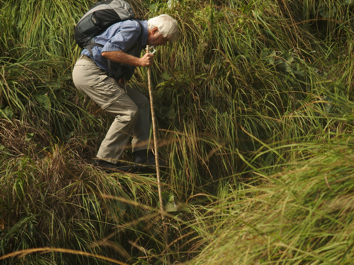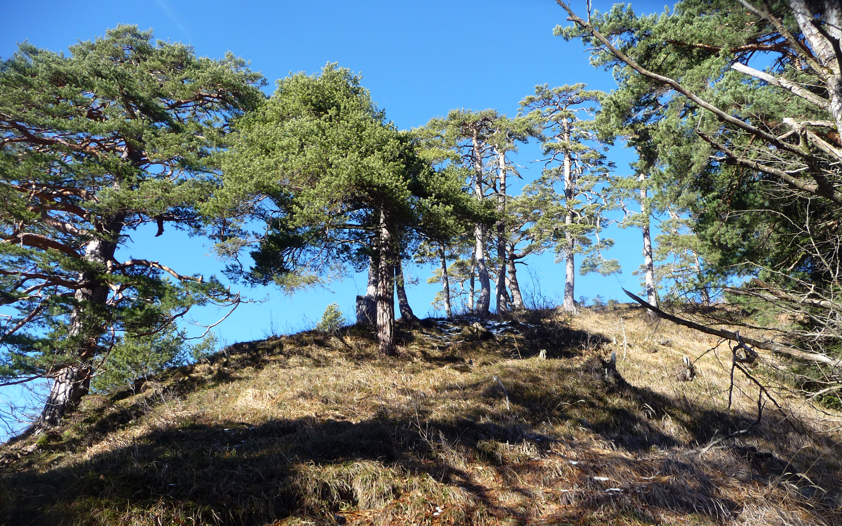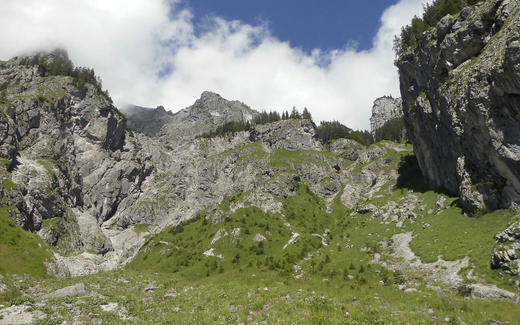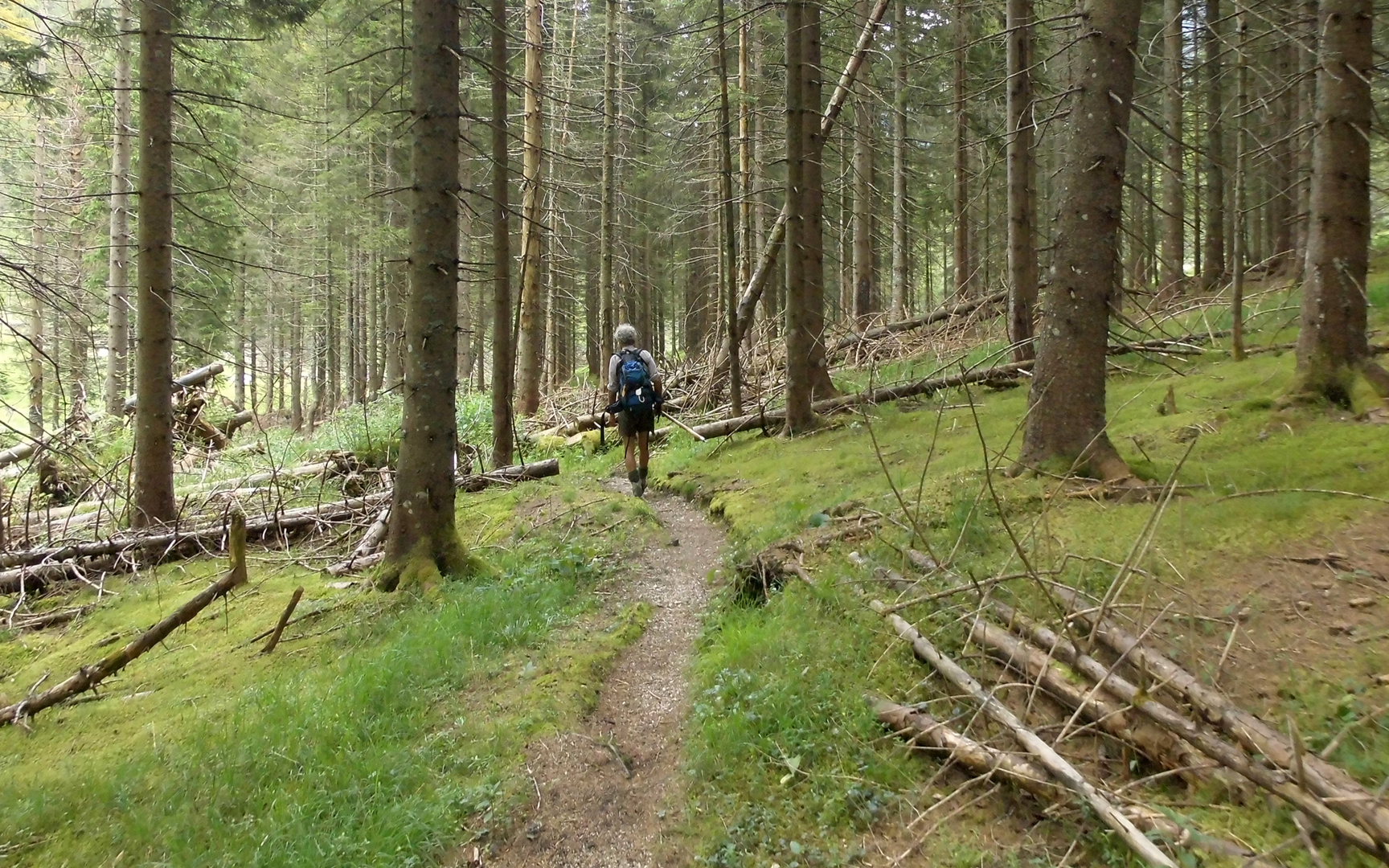 Der Steig, der früher ein Reitweg war, ist mit den Jahren zum Teil kaum noch zu finden. Lawinen haben ihn stellenweise weggeräumt, Stauden wachsen ihn zu. Für uns erschwerend kam hinzu, dass das hohe Gras der herbstlichen Vegetation den Verlauf oft nicht klar erkennen ließ.