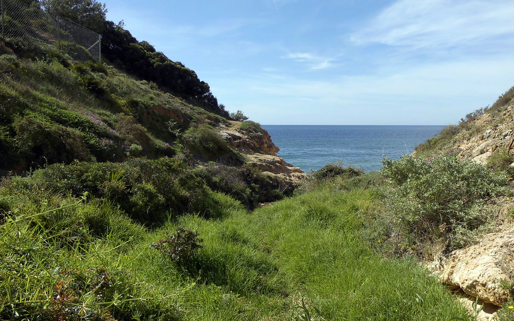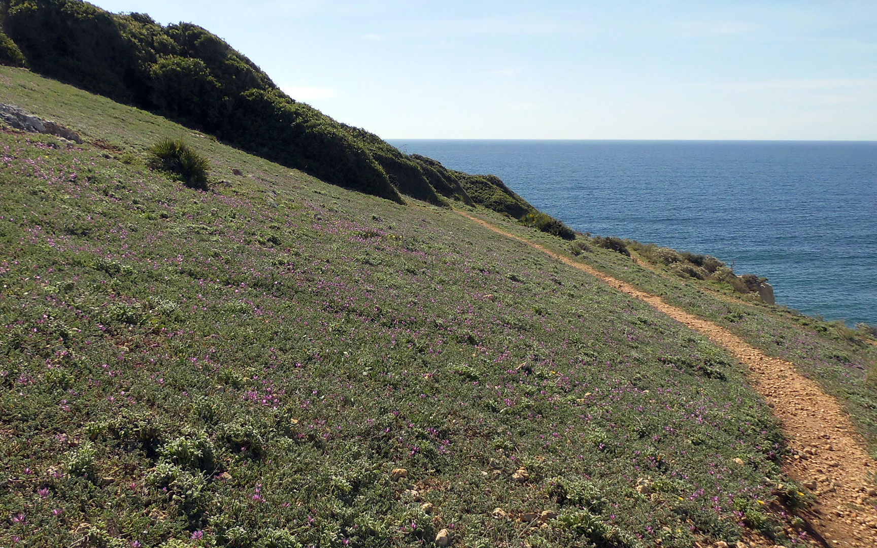 Die Länge des natürlichen Abschnitts, vom Farol (Leuchtturm) von Ferragudo bis nach Carvoeiro ist auf einer Tafel mit 5,3 km angegeben und weist Schwierigkeiten auf, die bei uns in den Alpen mit einem roten Punkt gekennzeichnet würden. Die Dauer für die einfache Strecke ist mit +/- 3 Stunden angegeben. An guten Tagen, und wenn ich mich nicht zu lange mit den Blumen beschäftige, brauche ich 1,5 Stunden.