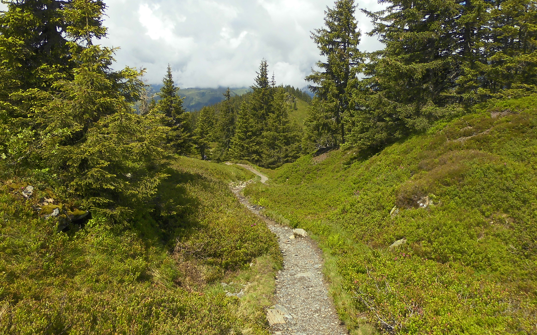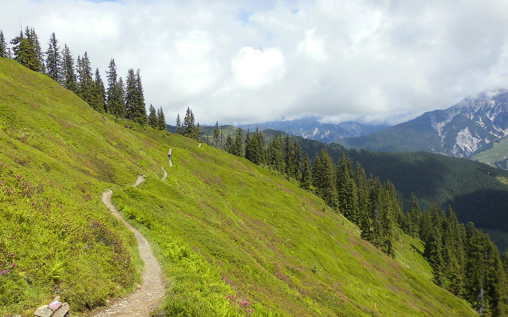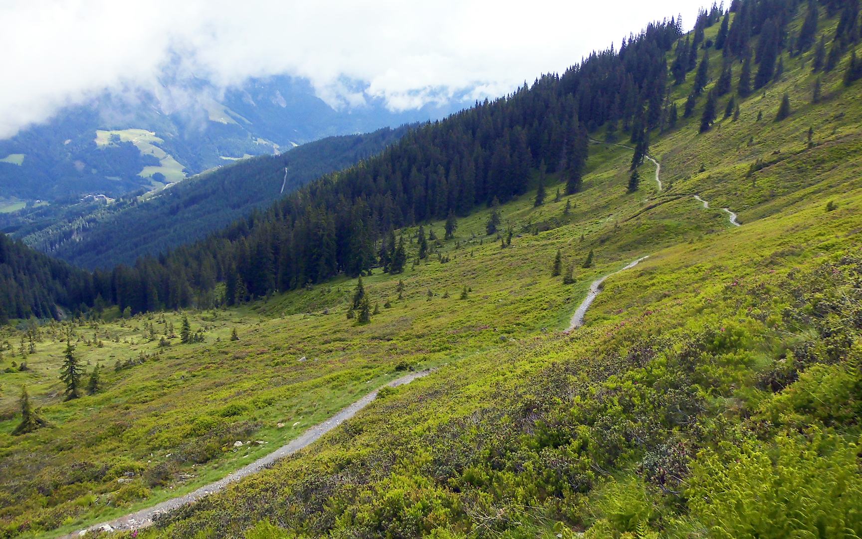 Kurz hinter dem Barnkogel beginnt man den Abstieg über die Spielbergalmen zum Unterberghaus auf 1000 m.