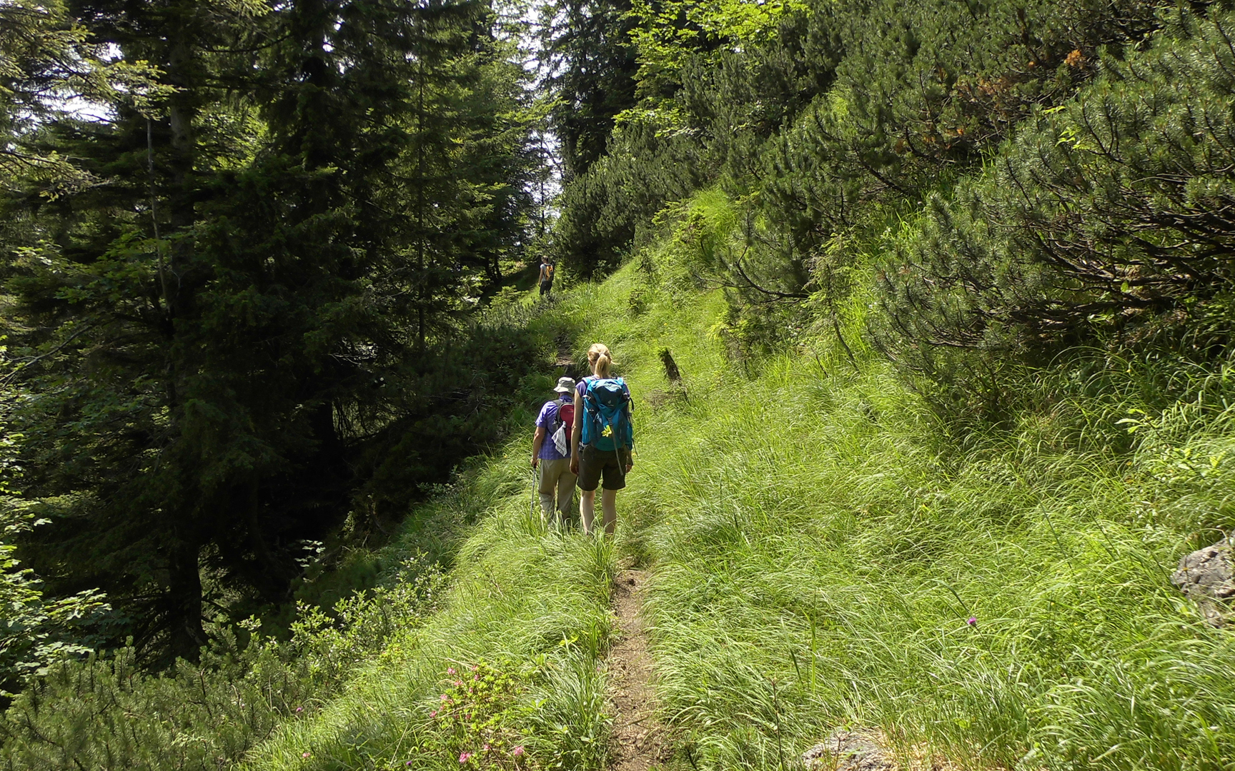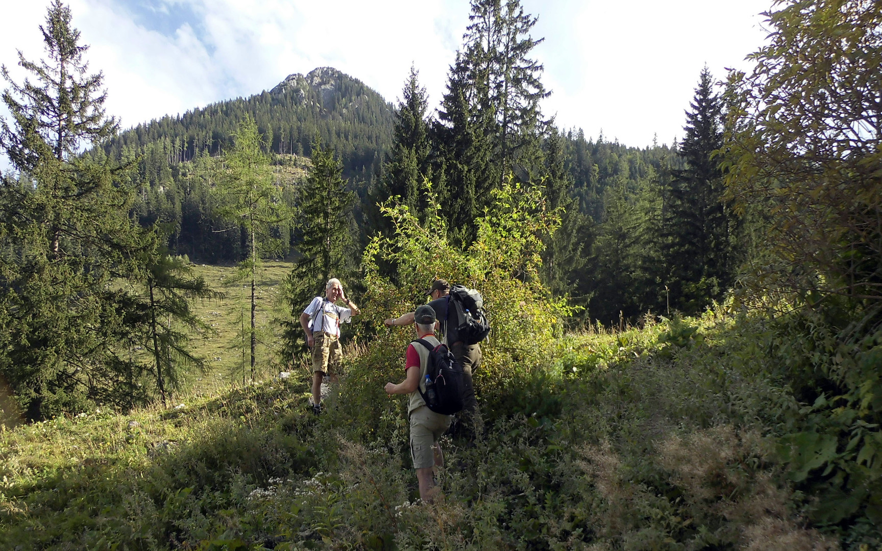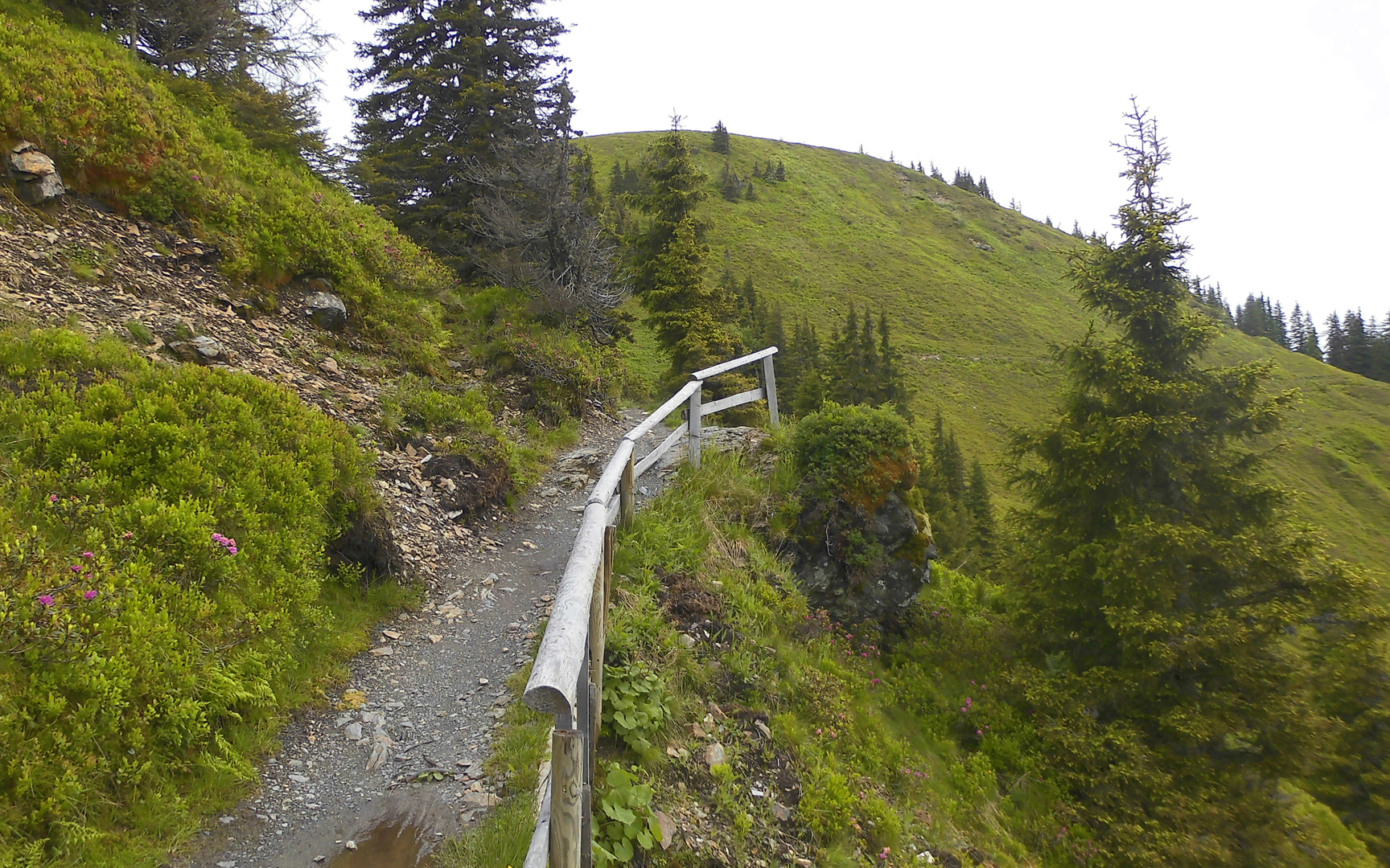 Zurück ging es zunächst durch das Gelände bis zum bequemen Rundweg um den Litzlkogel. Am Jagdhaus vorbei, über den Bockbrucksteig, die Litzlalm zurück zum Hirschbichl. Mit der Gesellschaft machte ich dort noch eine Pause, bevor ich alleine zur Bindalm weiter zog.