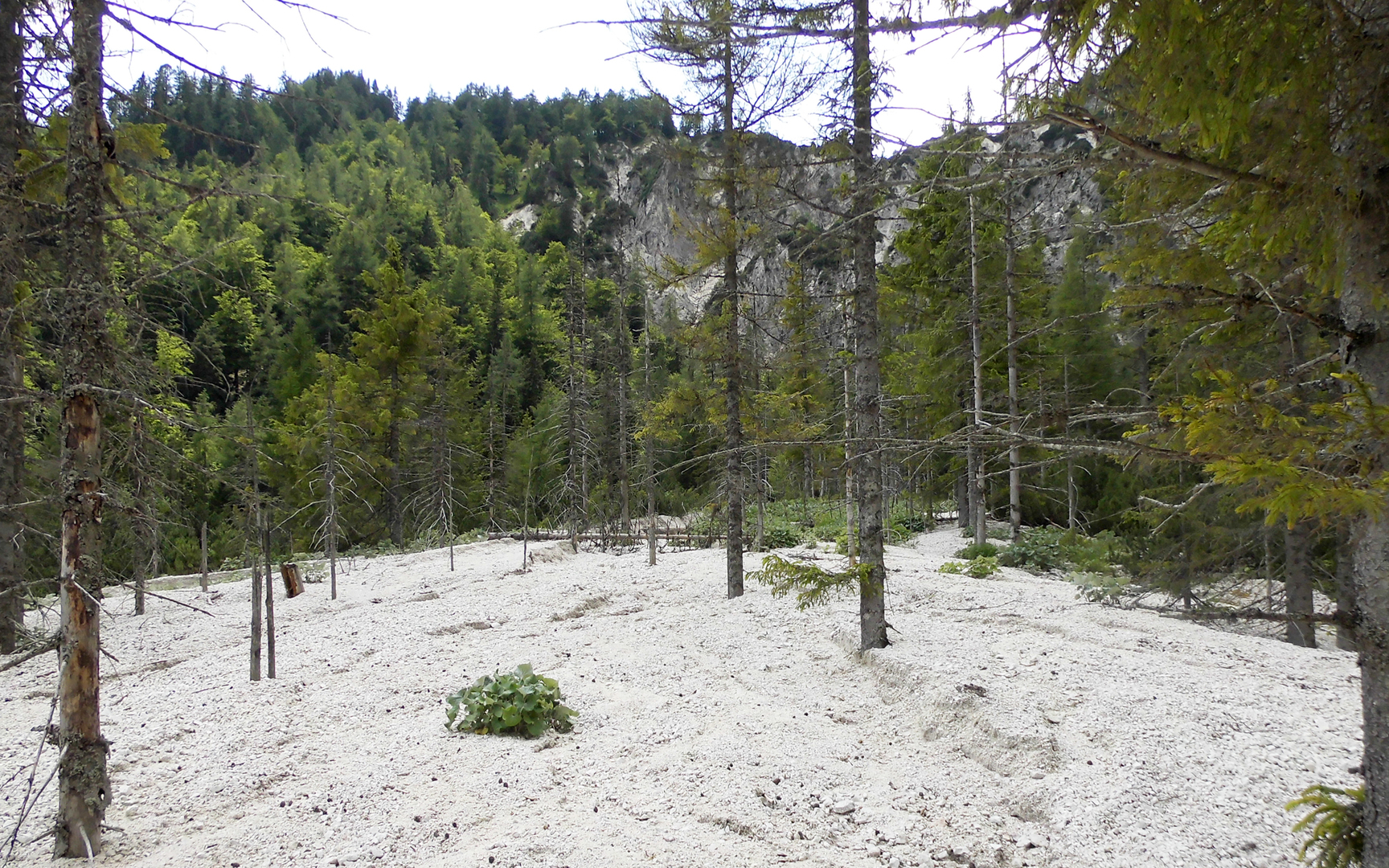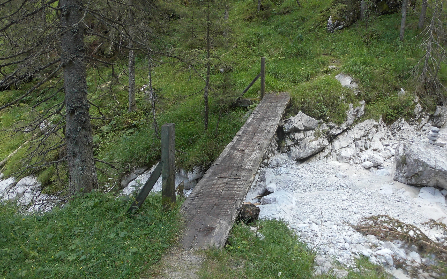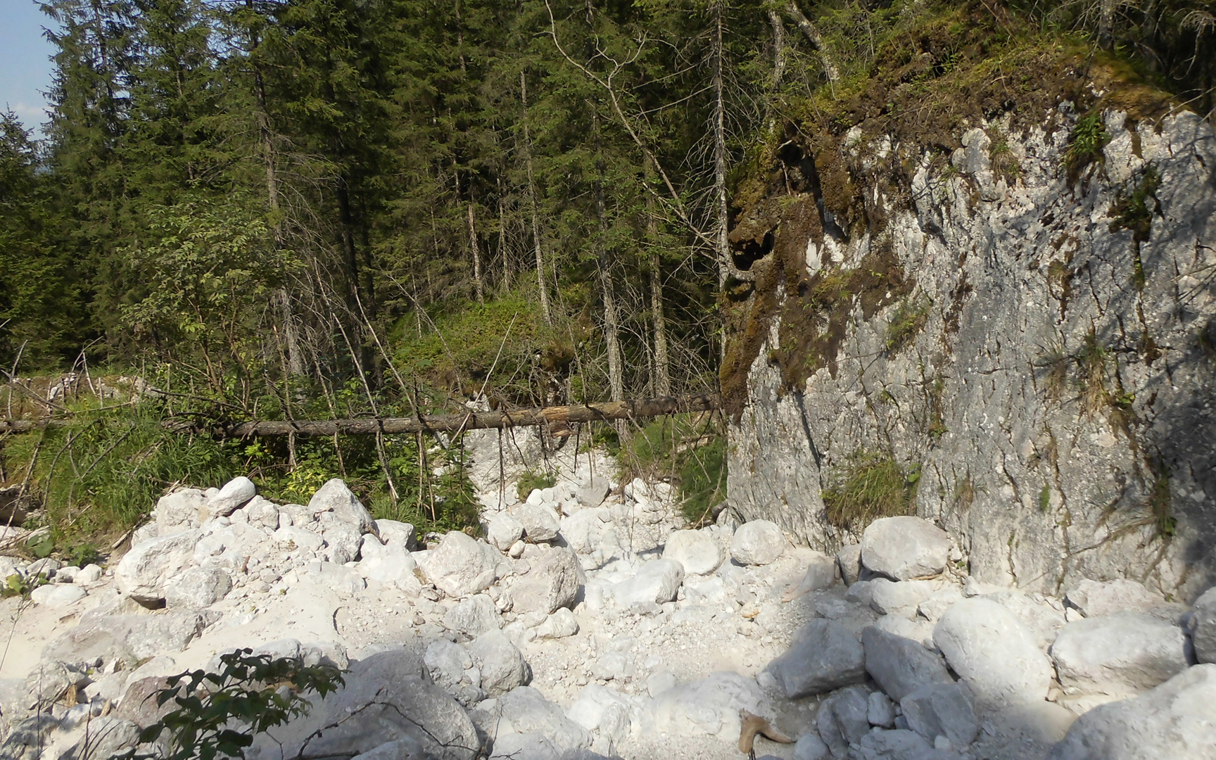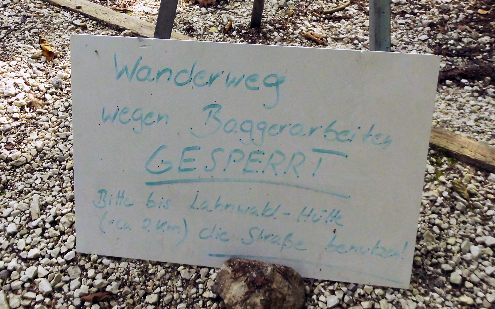Der Abstieg verlief zunächst wie der Hinweg, auf dem Begangsteig überquerten wir aber jetzt den Sittersbach. Dann auf dem Steig links vom Bach, vorbei an der ehemaligen Sittersbach-Holzstube bis auf den ‚gesperrten‘ Forstweg. Jetzt wollten wir es wissen, warum ‚Baggerarbeiten‘ zwei geländegängige Bergwanderer aufhalten sollten. Baggerarbeiten waren nicht zu erkennen, dafür fehlte eine Brücke. Da wegen der Trockenheit kein Wasser floss, war es ein Leichtes unseren Weg wie geplant zu Ende zu gehen.