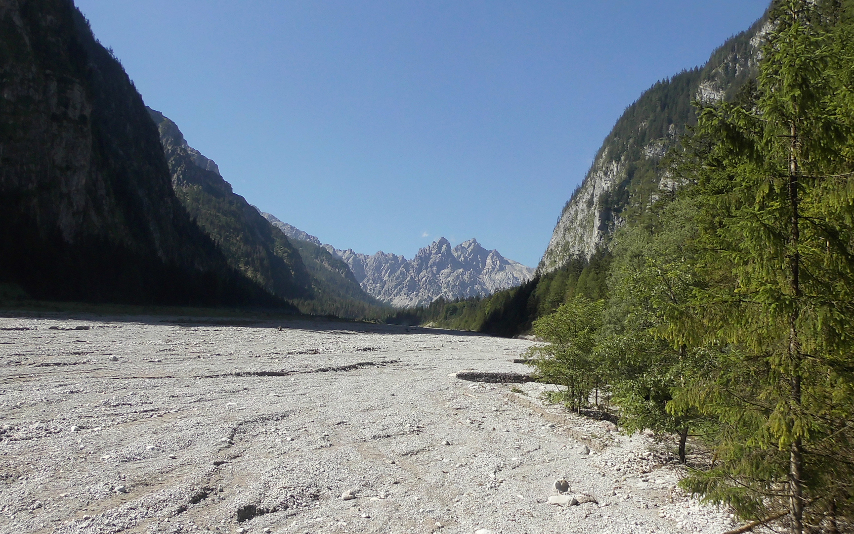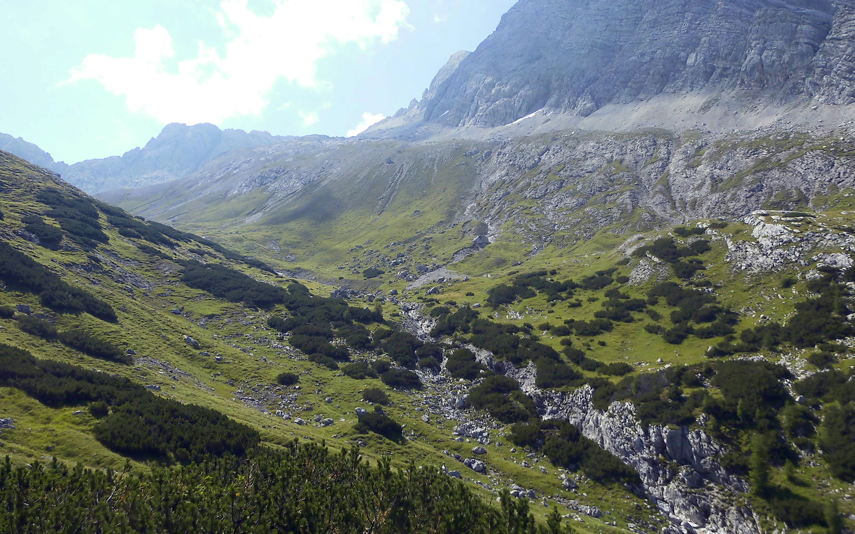 Am 10.08.2015 ging es von der Hirschbichlstraße ins Ofental. Eine Tafel mit seltsamer Aufschrift versperrte uns dort zunächst den direkten Weg ins Sittersbachtal. Wir folgten nicht der unverständlichen Bitte auf der Tafel, sondern begingen einen anderen, mir bekannten Weg. Der führte hinauf ins Ofental bis zum Begangsteig. Dem folgten wir bis zum Sittersbach. Von dort, links vom Bach, der vollkommen trocken lag, hinauf bis auf 1.800 m ins Hinterbergkar.