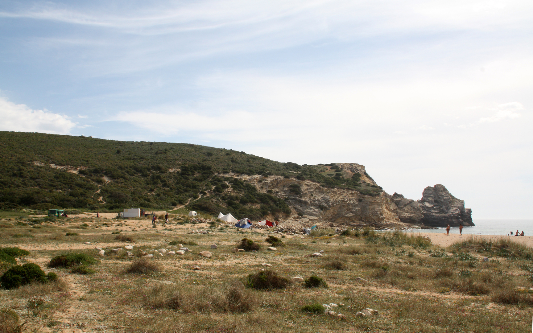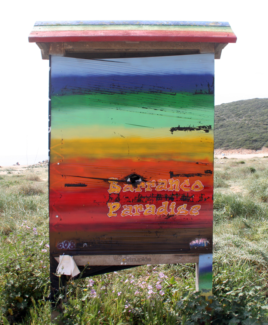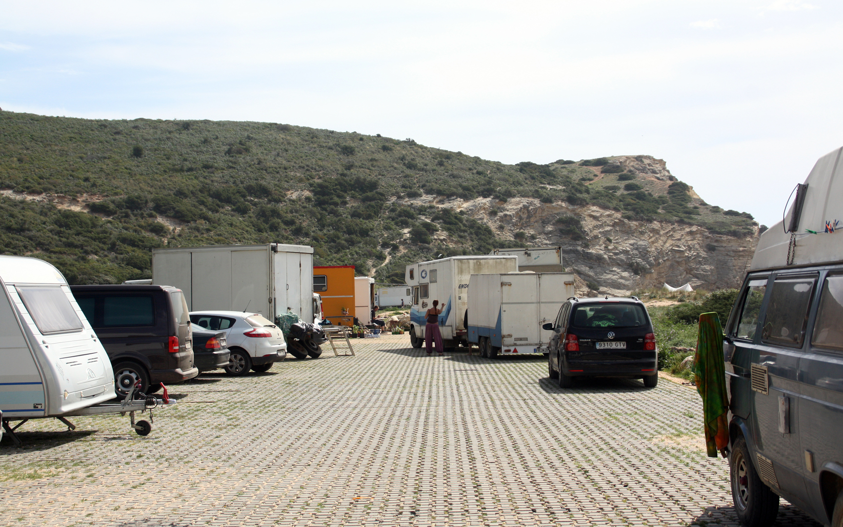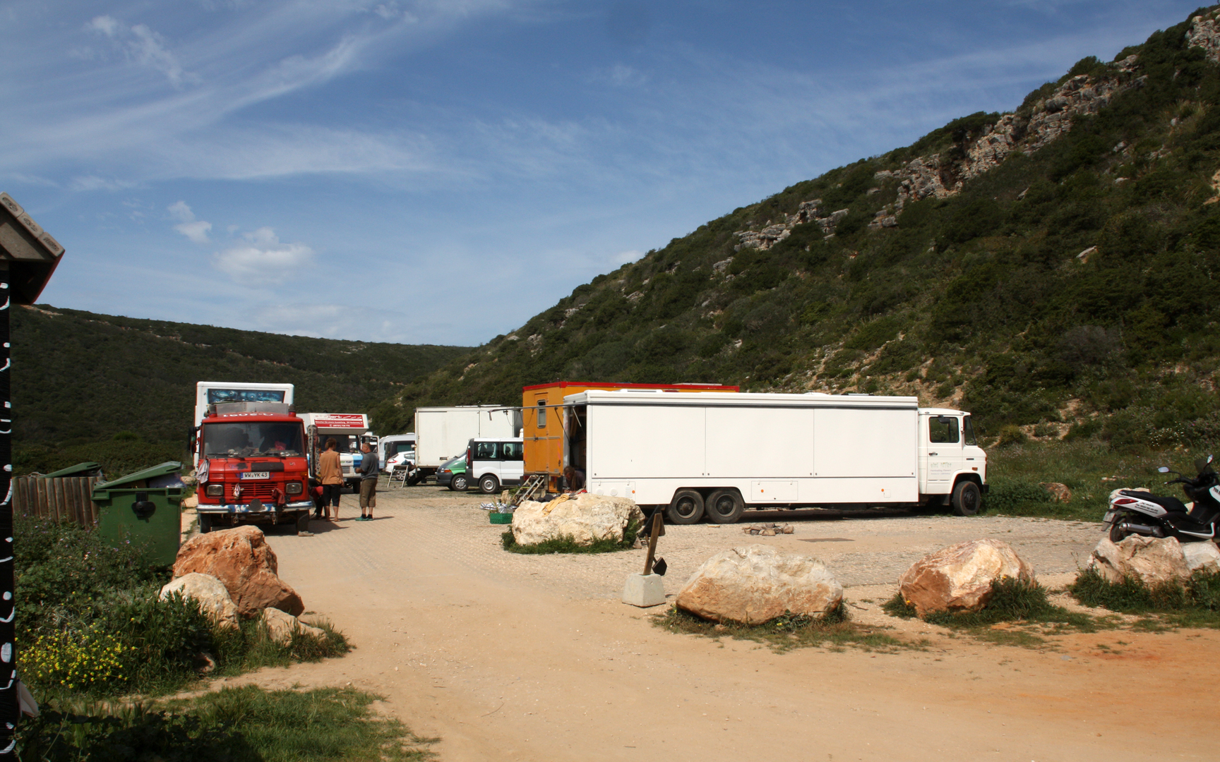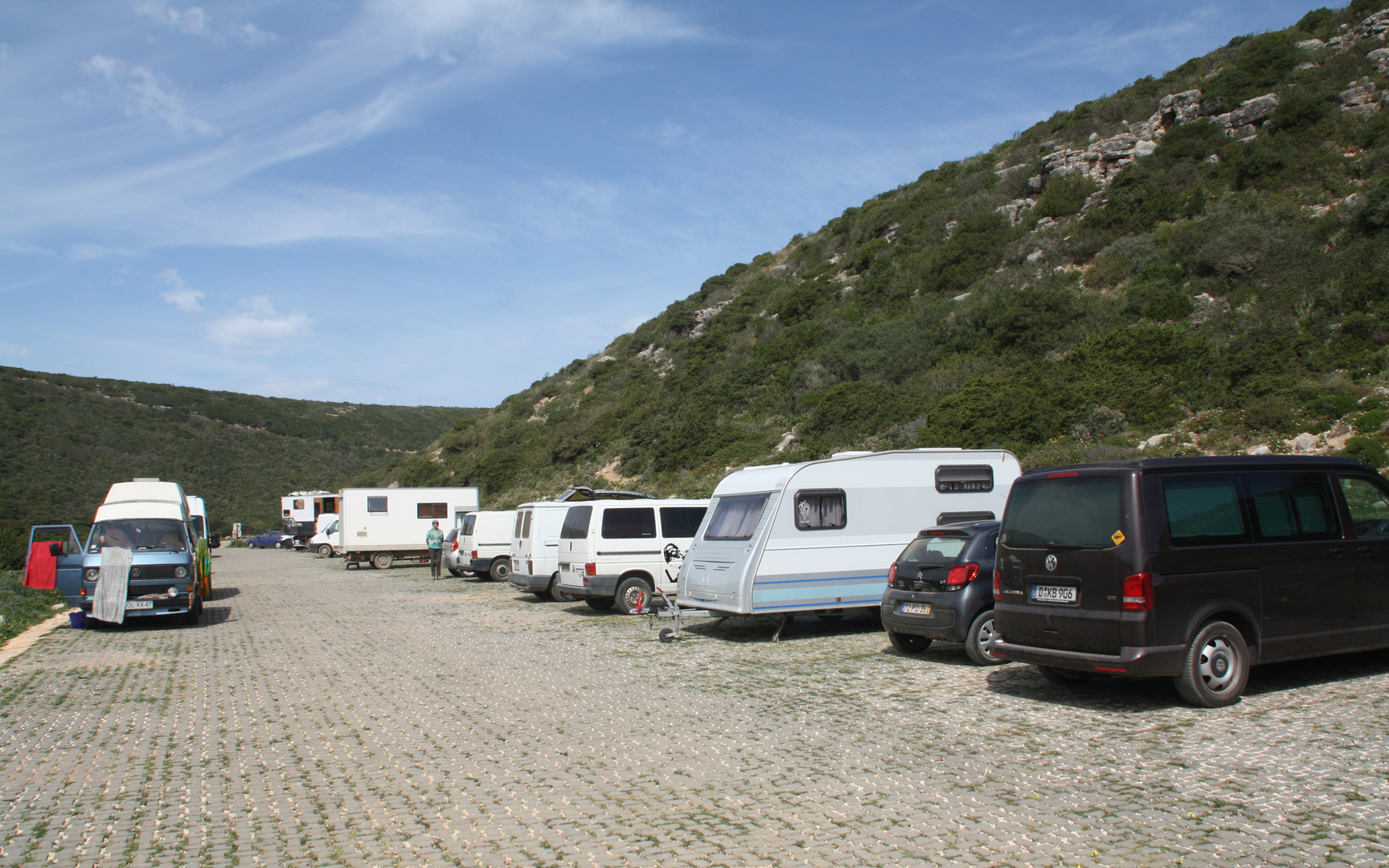 Die Zufahrt zur Praia do Barranco ist etwas abenteuerlicher, wie man auf den Fotos sehen kann. Die meist losen Steine erzeugen einen melodischen Klang beim Überfahren. Auf dem Parkplatz an der Bucht glaubt man sich 30 Jahre zurück in die Hippyzeit versetzt.